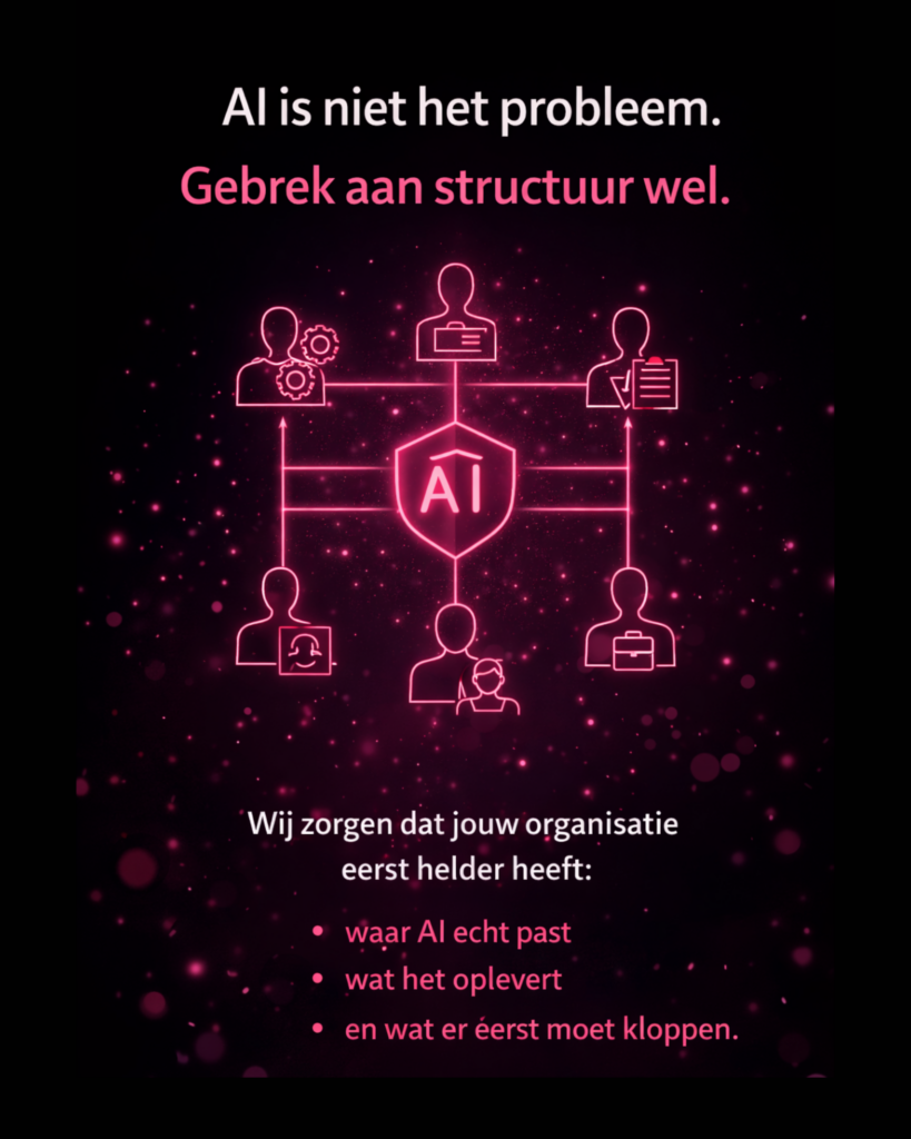 Wij helpen organisaties scherp krijgen waar AI echt past, wat eerst moet kloppen en hoe je AI verantwoord inzet zonder extra ruis, losse experimenten of onduidelijke keuzes.